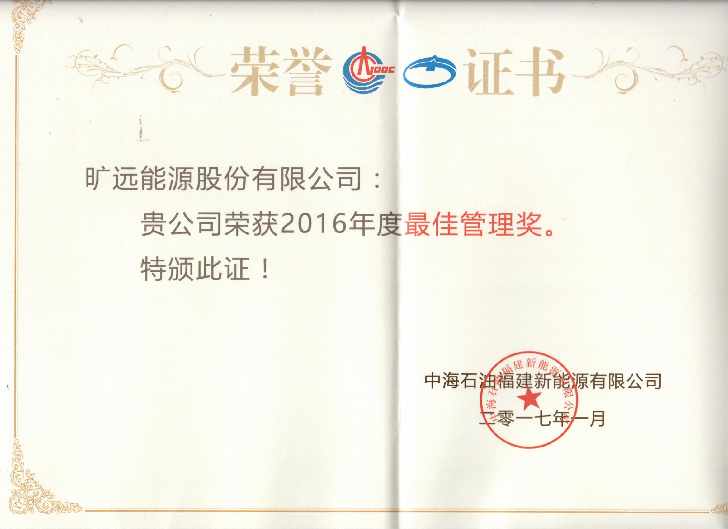 2017年1月 获得中海石油福建新能源有限公司授予的“2016年度最佳管理奖”